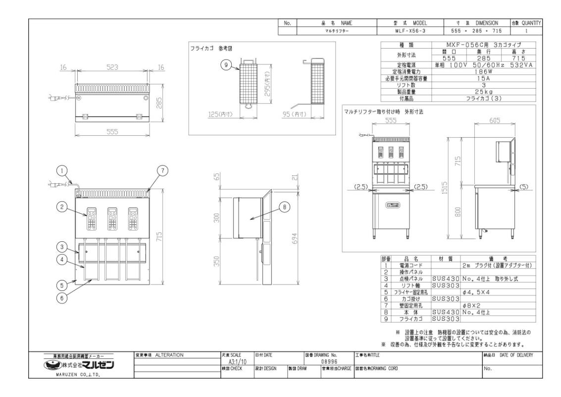MLF-X56-3 【マルゼン】 マルチリフター MXF-056C用 3カゴタイプ 単相100V 幅555×奥行285×高さ715