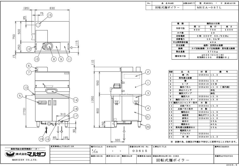 【マルゼン】電気回転式麺ボイラー MREA-087L 幅830×奥行750×高さ1350 3相 200V 50/60Hz