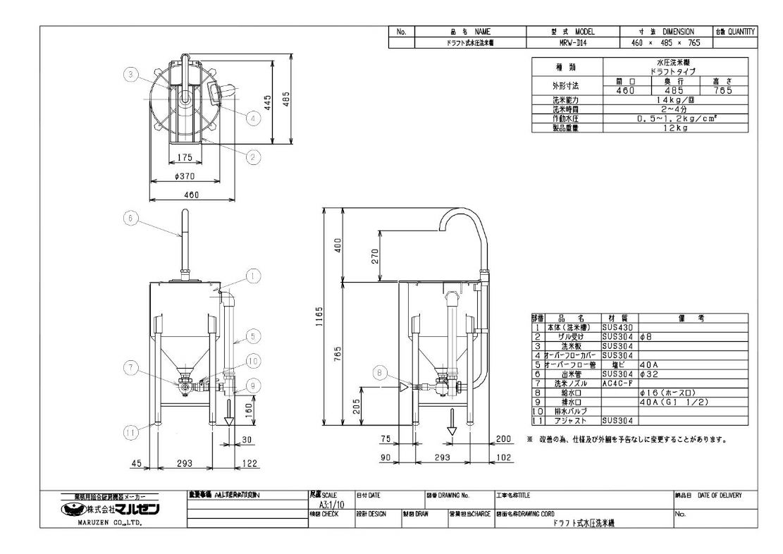 【マルゼン】ドラフト式水圧洗米機 MRW-D14 幅460×奥行485×高さ(全高)765(1165)mm