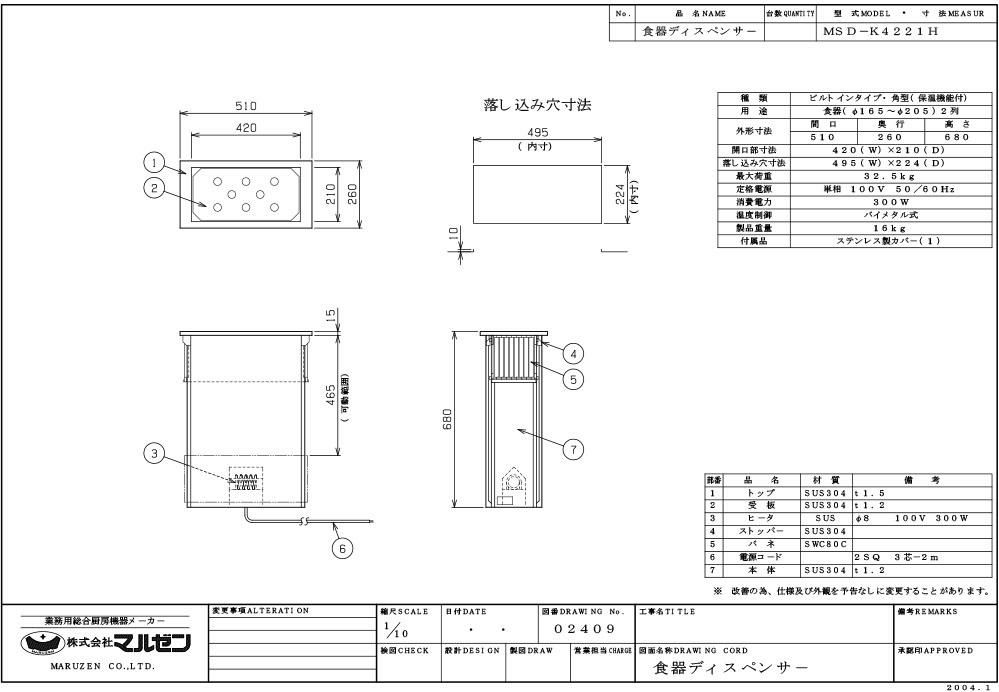 【マルゼン】食器ディスペンサー MSD-K4221H 幅510×奥行260×高さ680 単相100V 50/60Hz