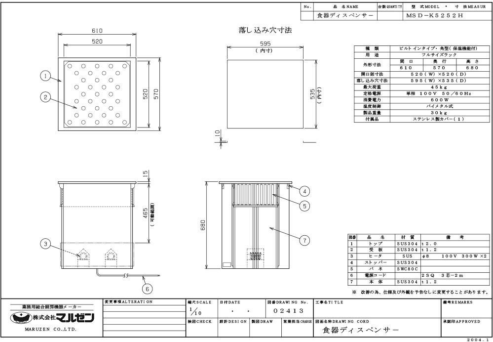 【マルゼン】食器ディスペンサー MSD-K5252H 幅610×奥行570×高さ680 単相100V 50/60Hz
