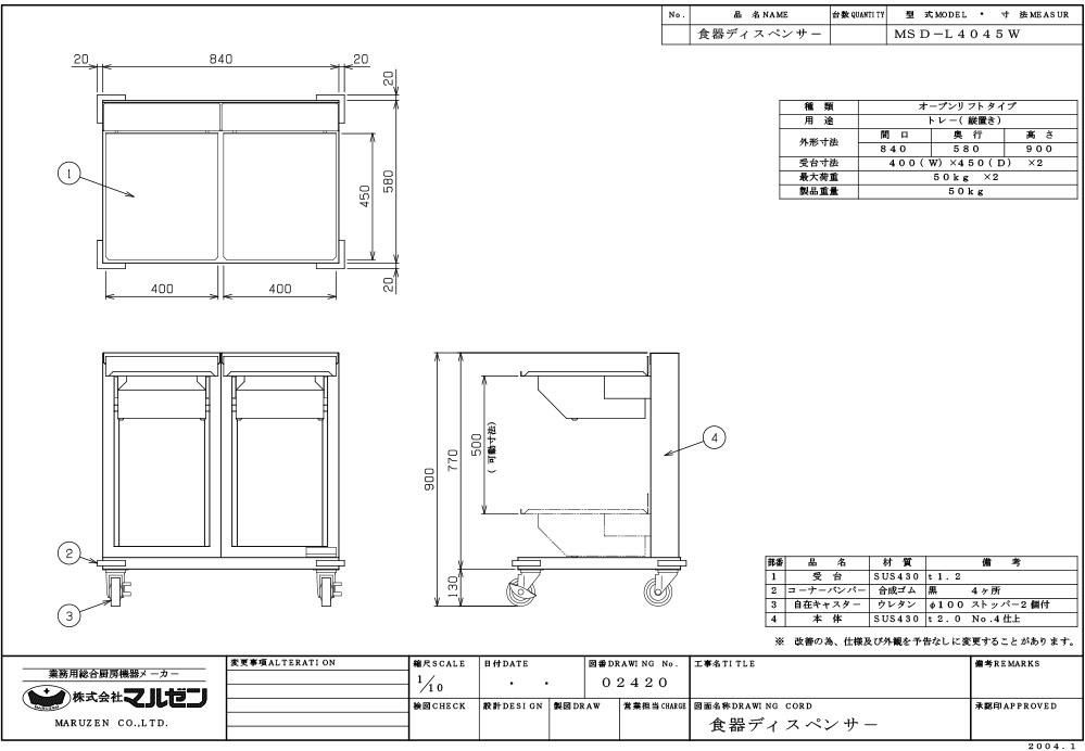 【マルゼン】食器ディスペンサー MSD-L4045W 幅840×奥行580×高さ900