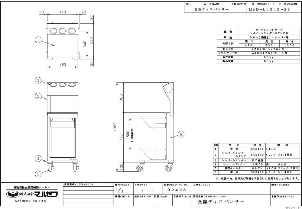 【マルゼン】食器ディスペンサー MSD-L4540-S3 幅470×奥行530×高さ1360