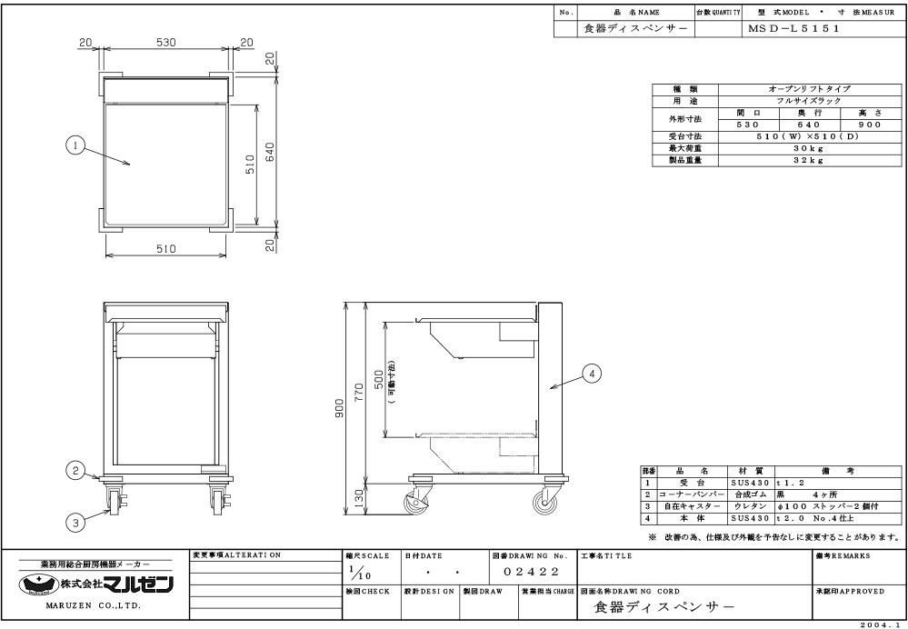 【マルゼン】食器ディスペンサー MSD-L5151 幅530×奥行640×高さ900