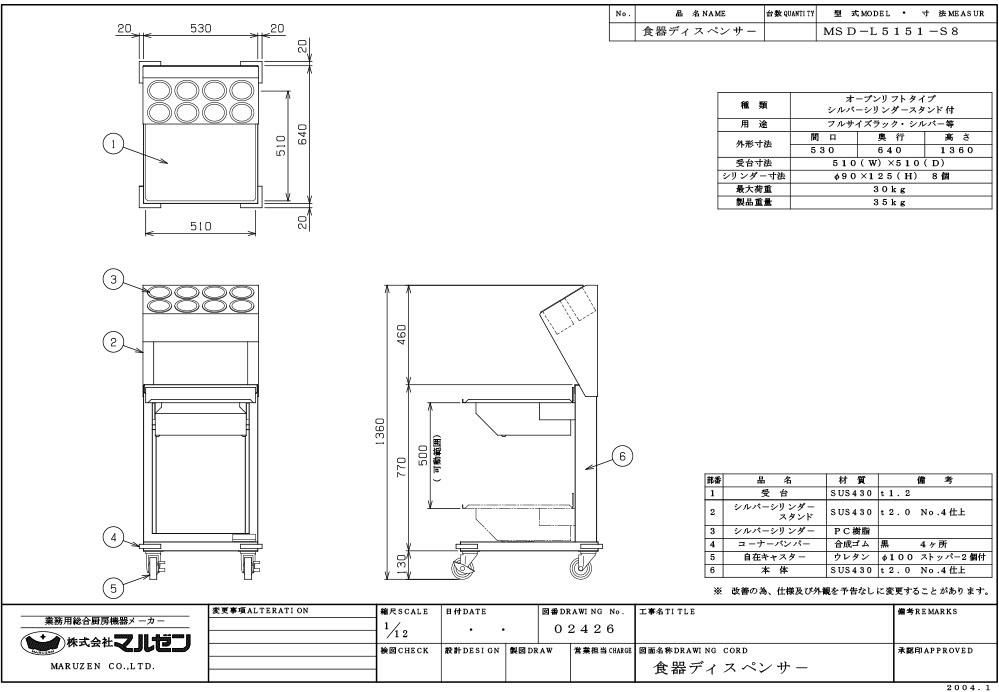 【マルゼン】食器ディスペンサー MSD-L5151-S8 幅530×奥行640×高さ1360