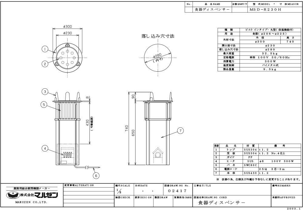 【マルゼン】食器ディスペンサー MSD-R230H 高さ740 単相100V 50/60Hz