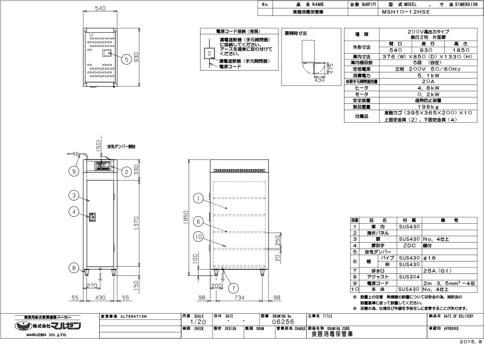 【マルゼン】食器消毒保管庫 200V・高出力タイプ 奥行2列 片面扉 MSH10-12HSE 幅540×奥行930×高さ1850