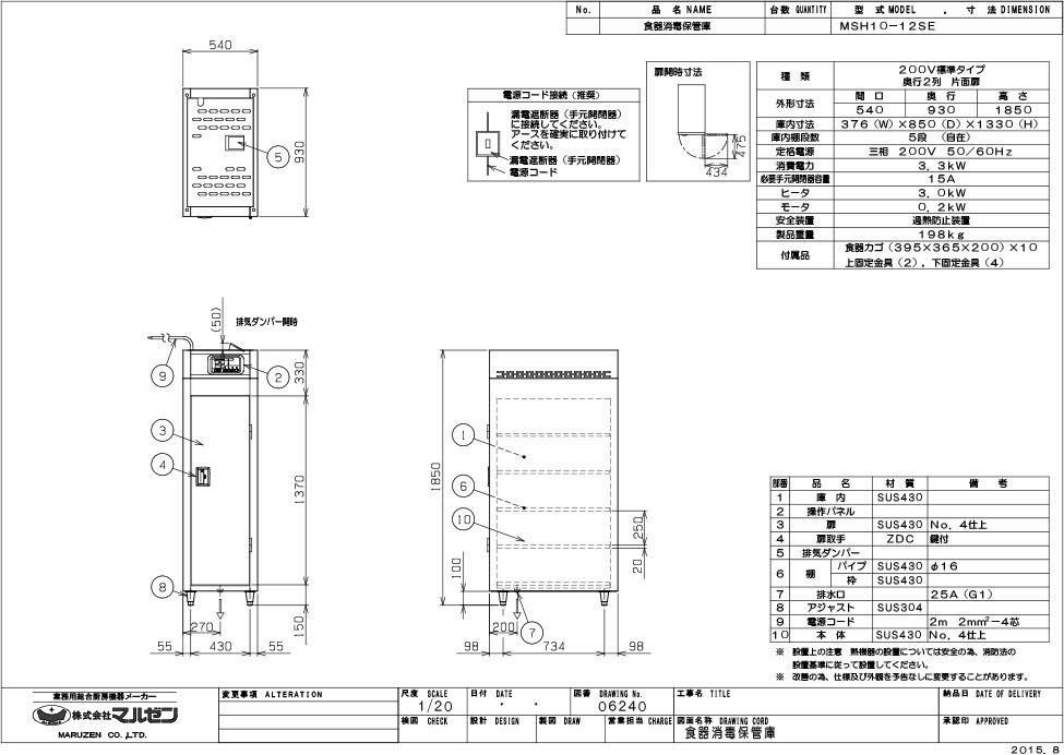 【マルゼン】食器消毒保管庫 200V・標準タイプ 奥行2列 片面扉 MSH10-12SE 幅540×奥行930×高さ1850