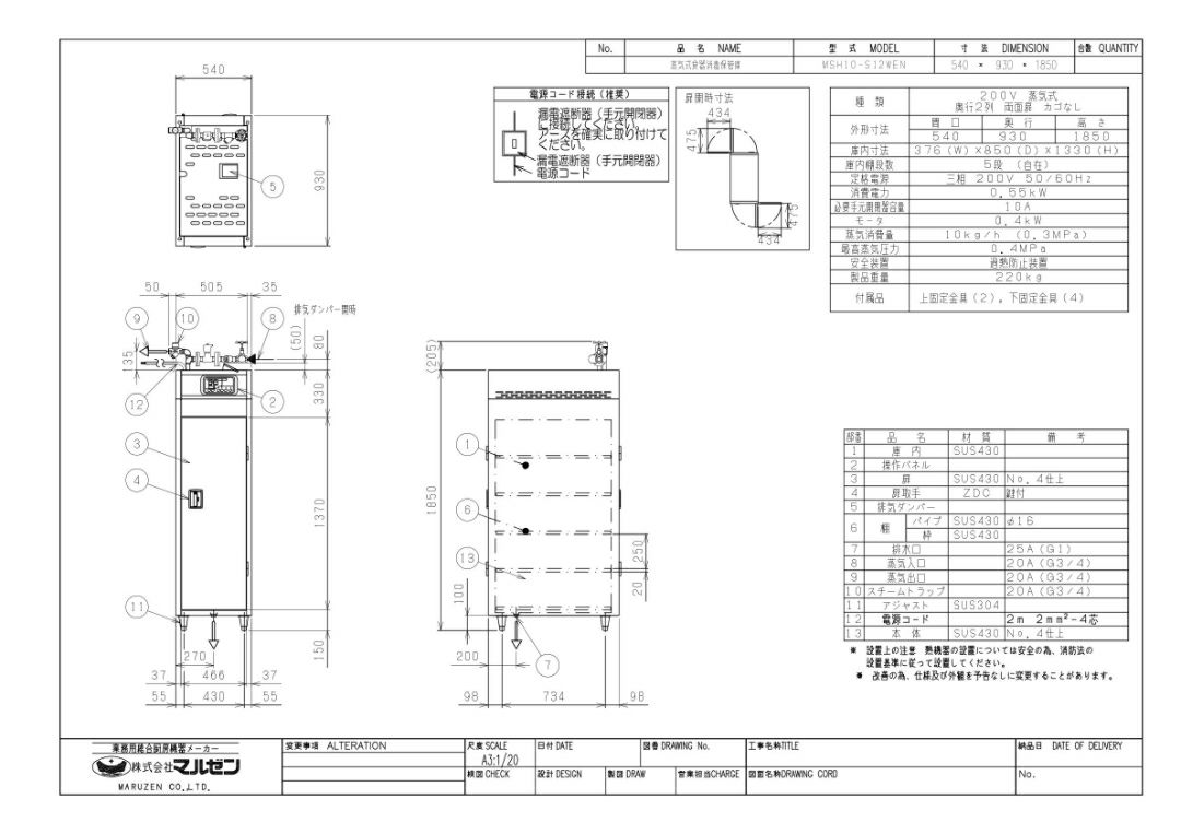 【マルゼン】蒸気食器消毒保管庫 食器カゴなしタイプ MSH10-S12WE(N) 幅540×奥行930×高さ1850 三相200V