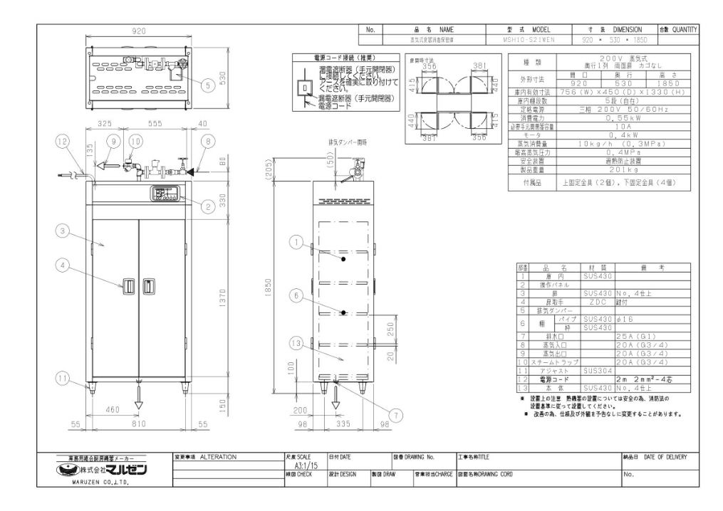 外形寸法:幅920×奥行530×高さ1850(mm)