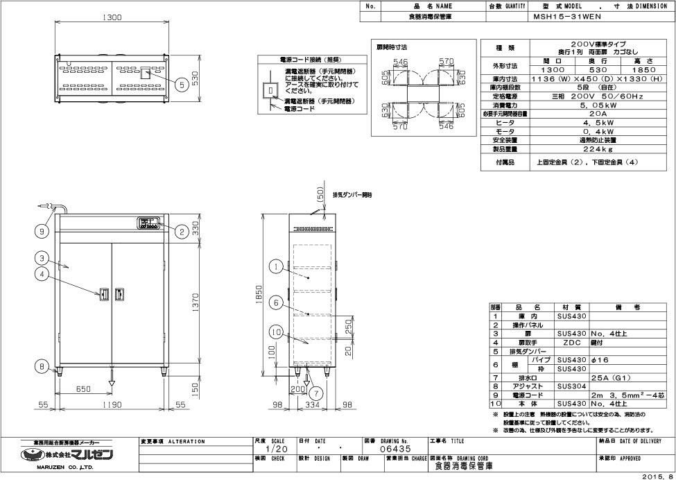 【マルゼン】食器消毒保管庫 200V・標準タイプ 奥行1列 両面扉 MSH15-31WEN 幅1300×奥行530×高さ1850