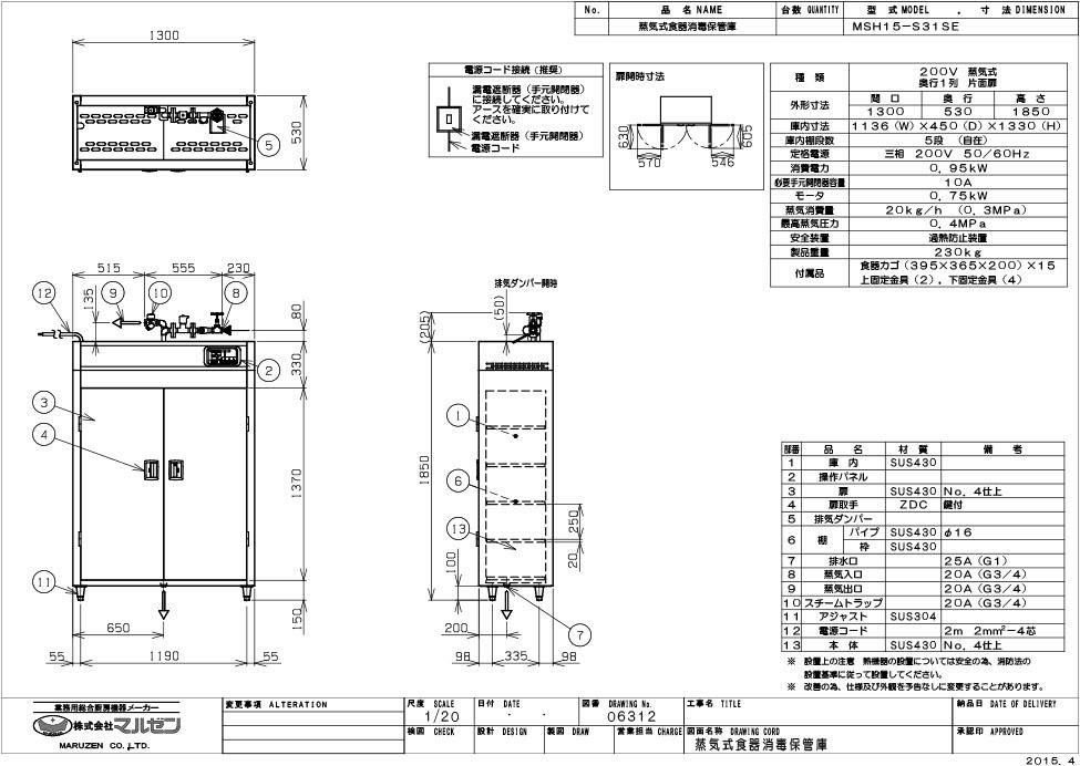 【マルゼン】蒸気食器消毒保管庫 標準タイプ 奥行1列 片扉 MSH15-S31SE 幅1300×奥行530×高さ1850