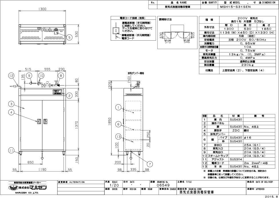 【マルゼン】蒸気食器消毒保管庫 標準タイプ 奥行1列 片扉 MSH15-S31SEN 幅1300×奥行530×高さ1850