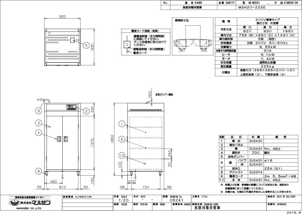 【マルゼン】食器消毒保管庫 200V・標準タイプ 奥行2列 片面扉 MSH20-22SE 幅920×奥行930×高さ1850