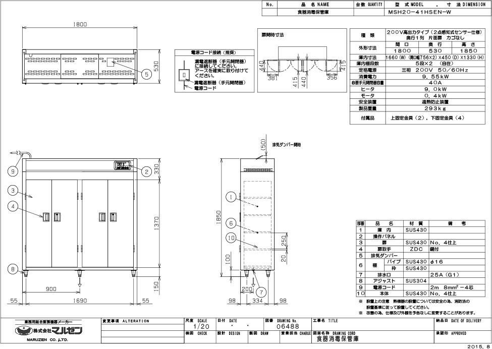 【マルゼン】食器消毒保管庫 200V・高出力タイプ 奥行1列 片面扉 MSH20-41HSEN-W 幅1800×奥行530×高さ1850