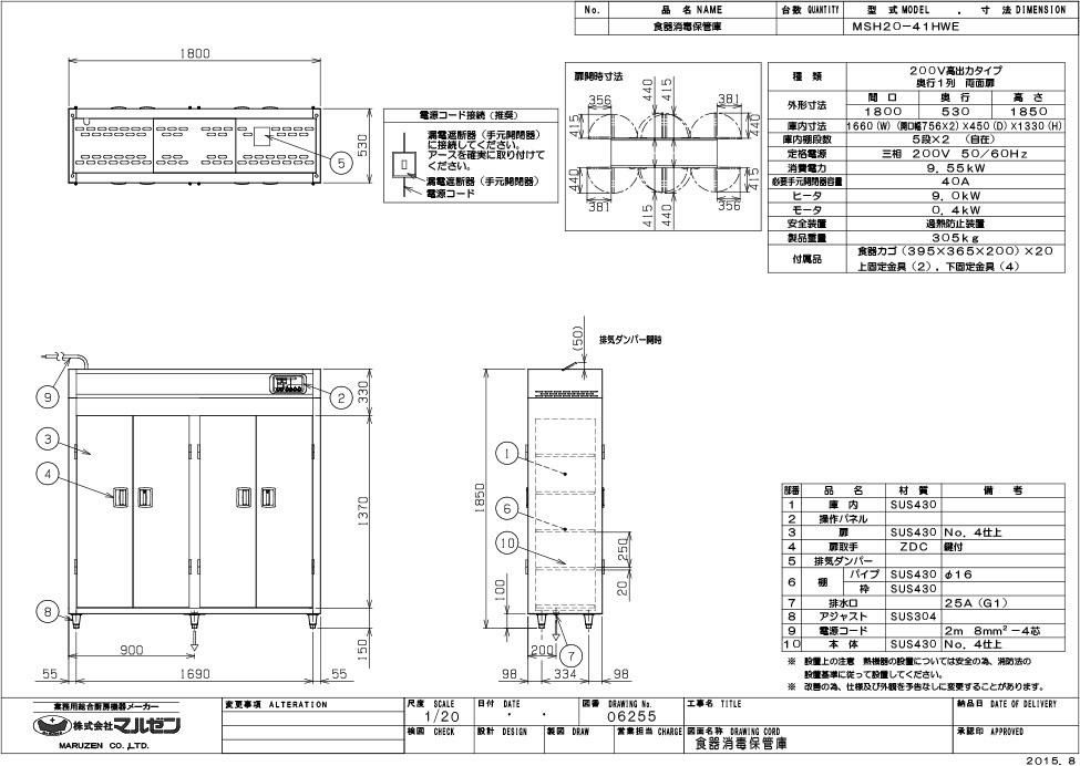 【マルゼン】食器消毒保管庫 200V・高出力タイプ 奥行1列 両面扉 MSH20-41HWE 幅1800×奥行530×高さ1850