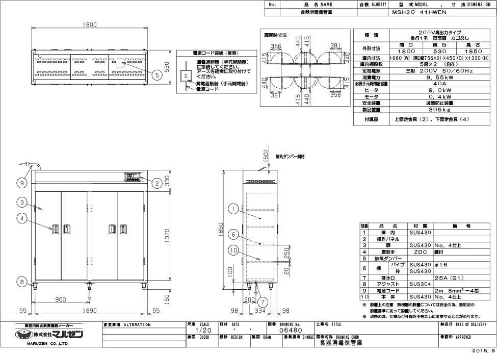 【マルゼン】食器消毒保管庫 200V・高出力タイプ 奥行1列 両面扉 MSH20-41HWEN 幅1800×奥行530×高さ1850