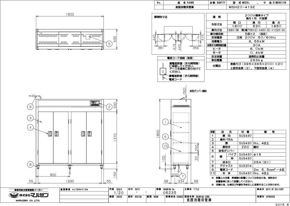 【マルゼン】食器消毒保管庫 200V・標準タイプ 奥行1列 片面扉 MSH20-41SE 幅1800×奥行530×高さ1850