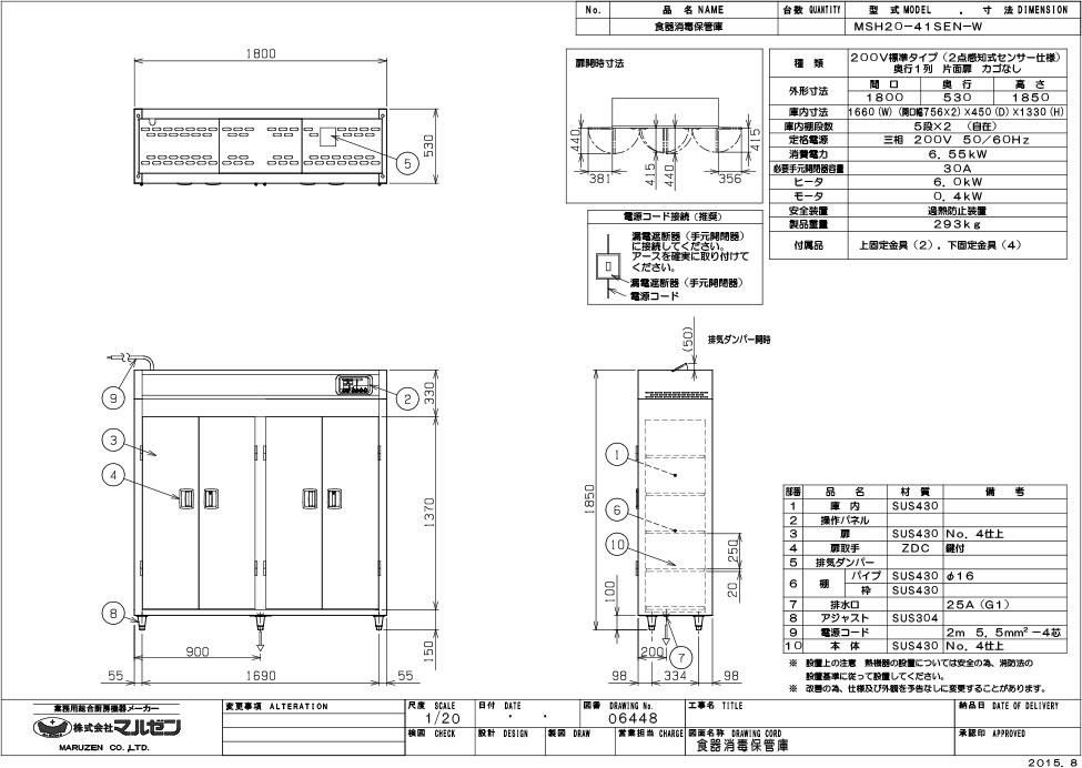 【マルゼン】食器消毒保管庫 200V・標準タイプ 奥行1列 片面扉 MSH20-41SEN-W 幅1800×奥行530×高さ1850