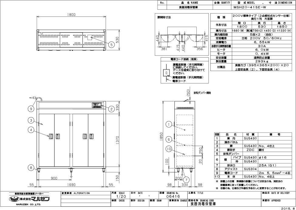 【マルゼン】食器消毒保管庫 200V・標準タイプ 奥行1列 片面扉 MSH20-41SE-W 幅1800×奥行530×高さ1850