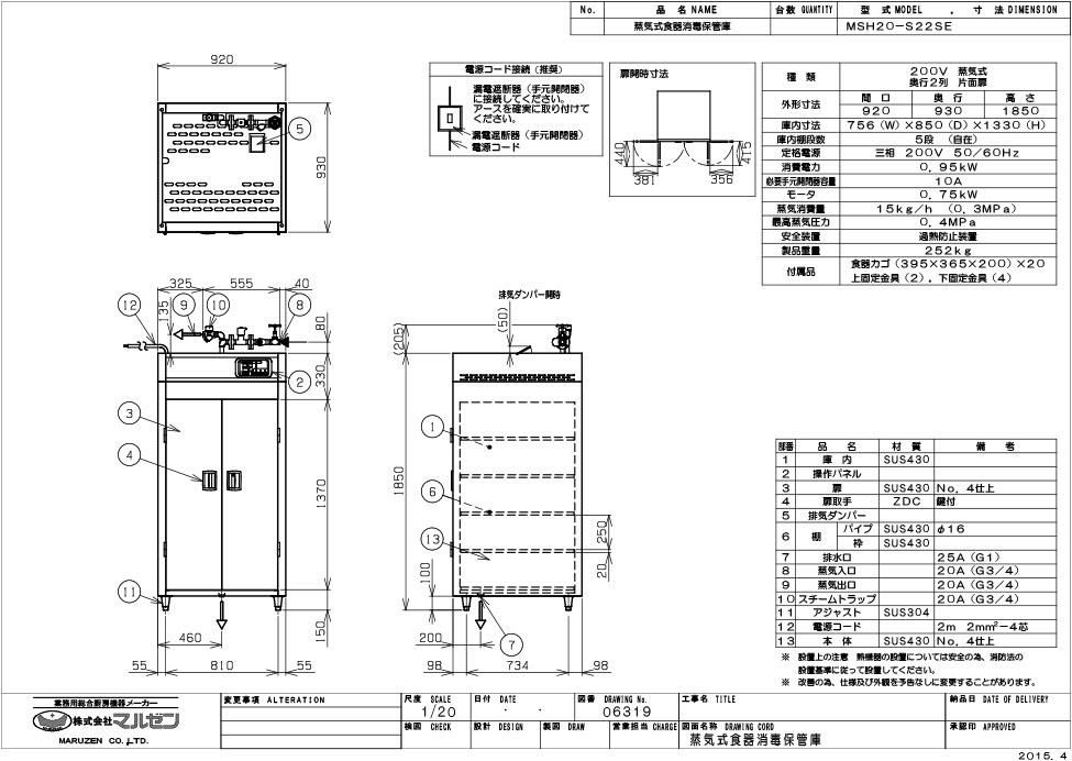 【マルゼン】蒸気食器消毒保管庫 MSH20-S22SE 幅920×奥行930×高さ1850 三相200V