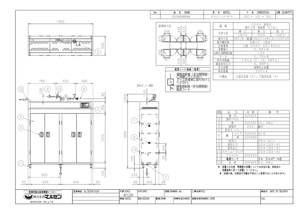 【マルゼン】蒸気食器消毒保管庫 食器カゴなしタイプ MSH20-S41WE(N) 幅1800×奥行530×高さ1850 三相200V