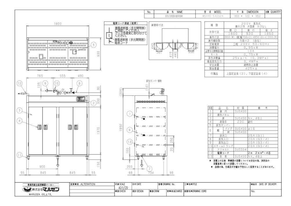 【マルゼン】蒸気食器消毒保管庫 食器カゴなしタイプ MSH40-S42SE(N) 幅1800×奥行930×高さ1850 三相200V