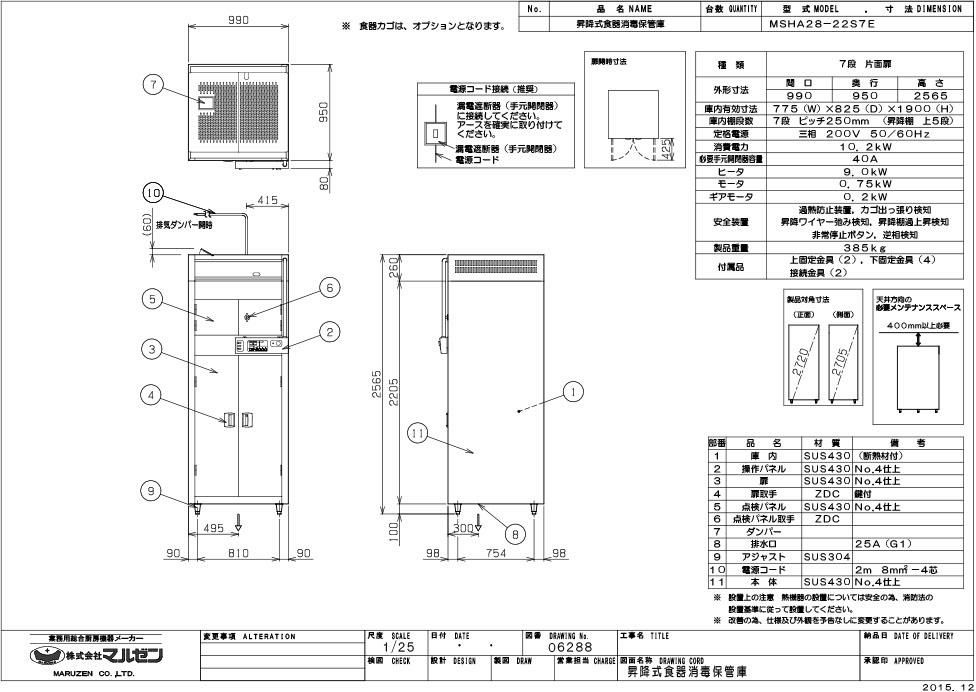 【マルゼン】食器消毒保管庫 昇降式 MSHA28-22S7E 幅990×奥行950×高さ2565 三相200V 50/60Hz