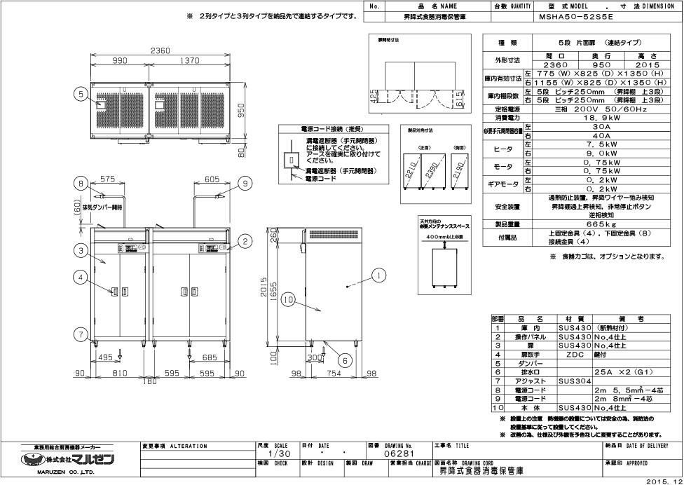 【マルゼン】食器消毒保管庫 昇降式 片面扉 (連結タイプ) MSHA50-52S5E 幅2360×奥行950×高さ2015 三相200V 50/60Hz