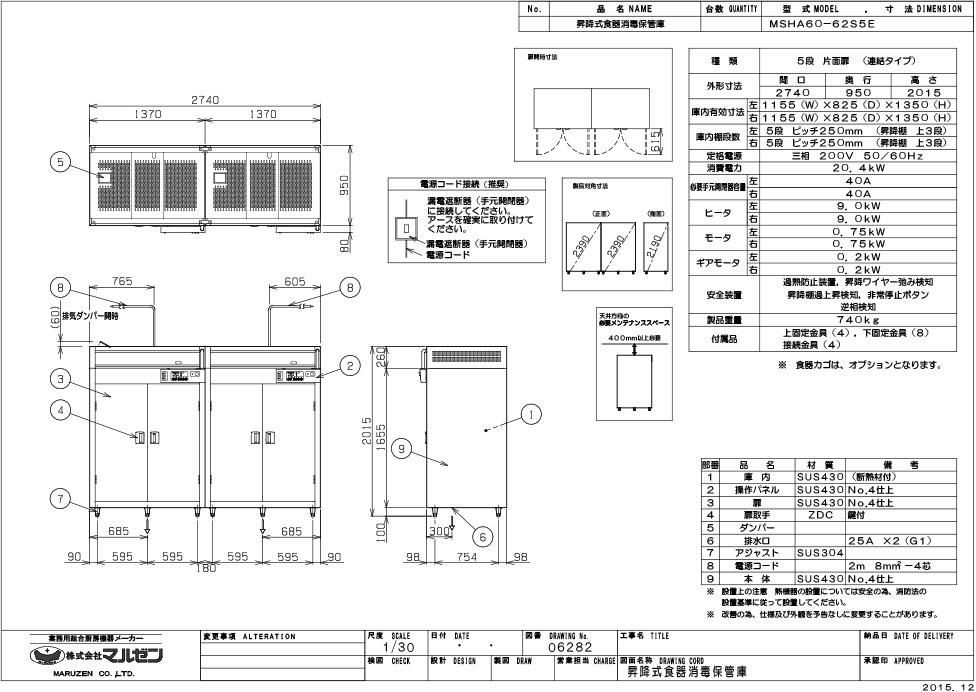 【マルゼン】食器消毒保管庫 昇降式 片面扉 (連結タイプ) MSHA60-62S5E 幅2740×奥行950×高さ2015 三相200V 50/60Hz