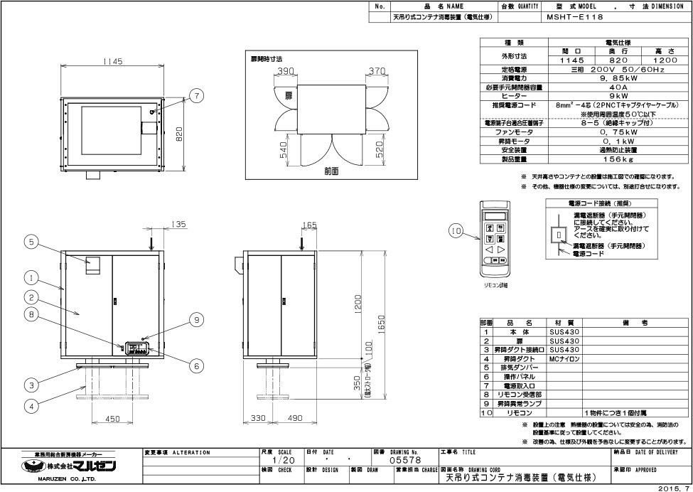 【マルゼン】天吊り式コンテナ消毒装置 MSHT-E118 幅1145×奥行820×高さ1200 三相200V 50/60Hz