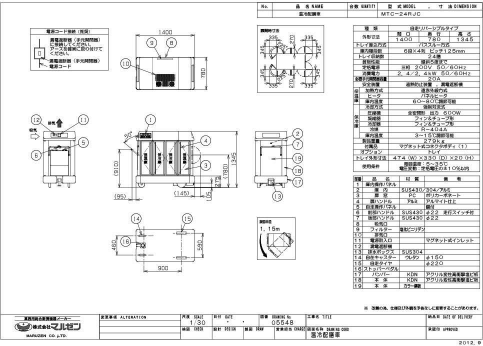【マルゼン】温冷配膳車 自走式 MTC-24RJC 幅1400×奥行780×高さ1345 三相200V