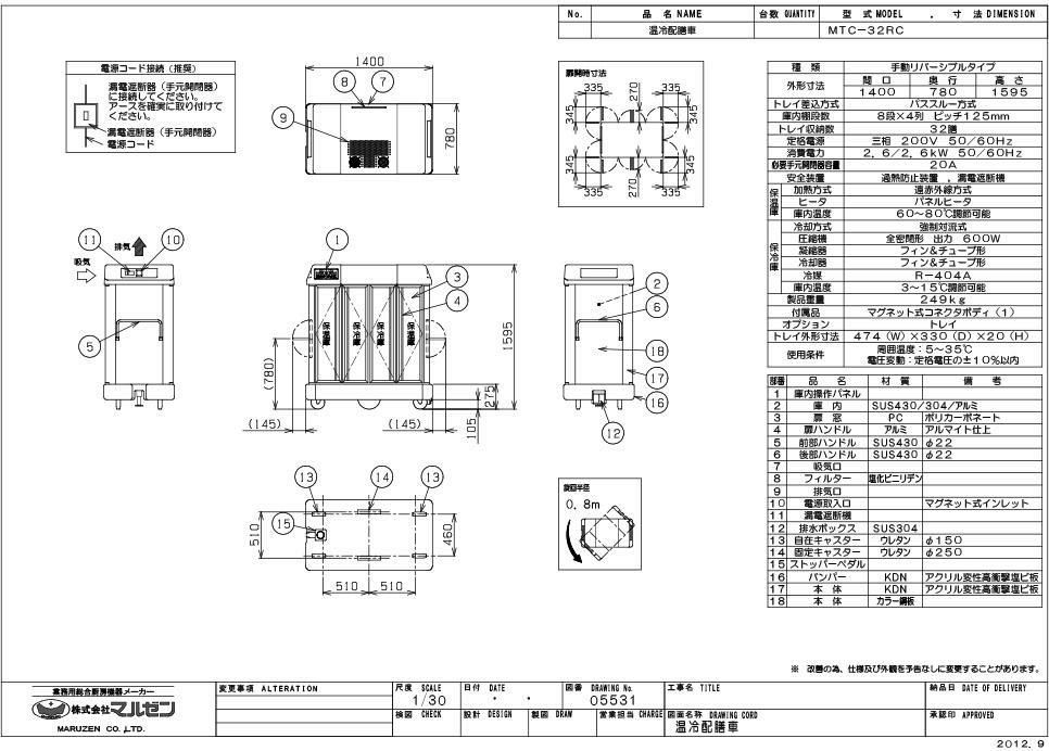商品名:温冷配膳車 手動式 MTC-32RC