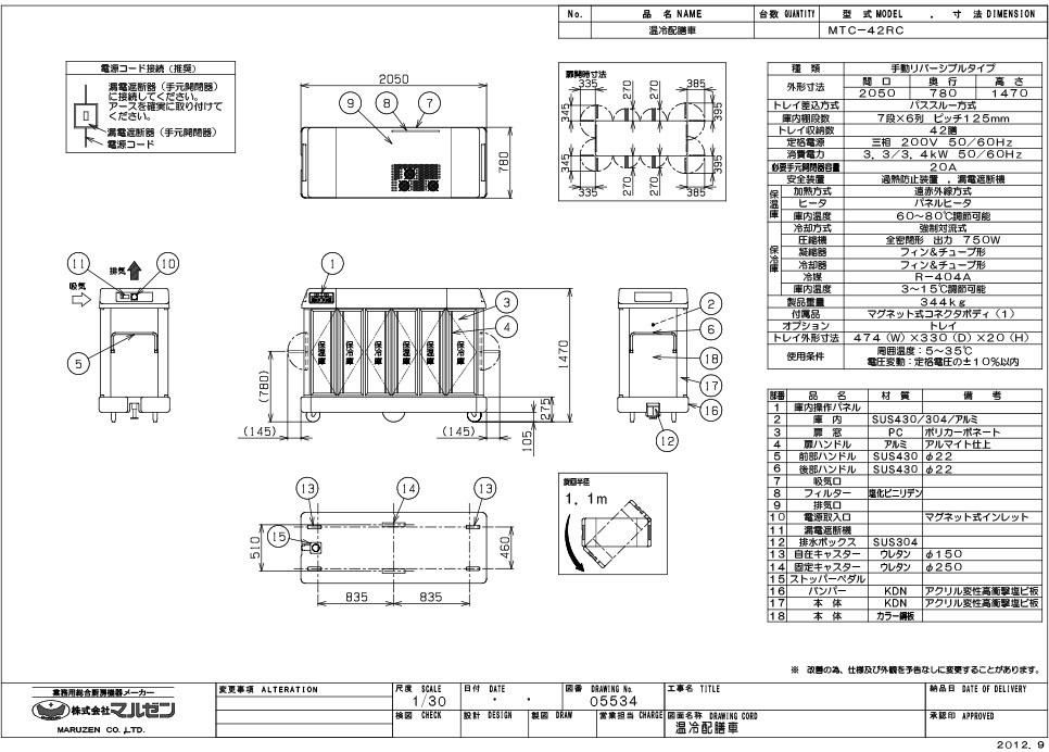 【マルゼン】温冷配膳車 手動式 MTC-42RC 幅2050×奥行780×高さ1470 三相200V