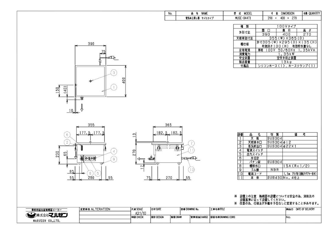 【マルゼン】電気卓上蒸し器 MUSE-044T1 幅390×奥行400×高さ270 単相100V