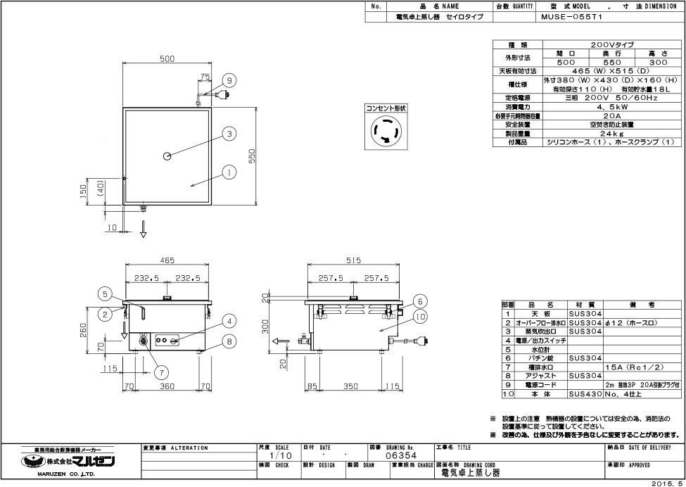 【マルゼン】電気卓上蒸し器 MUSE-055T1 幅500×奥行550×高さ300 三相200V 50/60Hz