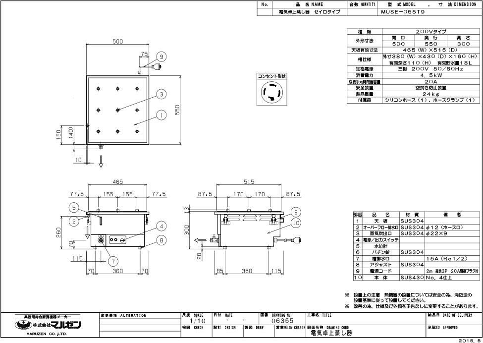 【マルゼン】電気卓上蒸し器 MUSE-055T9 幅500×奥行550×高さ300 三相200V 50/60Hz