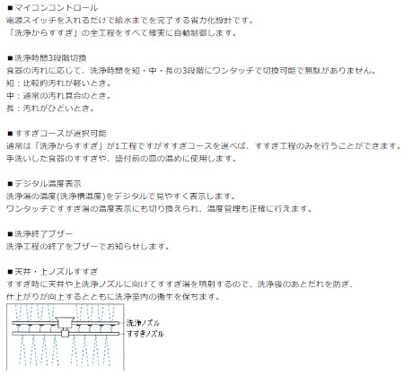 すすぎ時に天井や上洗浄ノズルに向けてすすぎ湯を噴射するので、洗浄後のあとだれを防ぎ、
