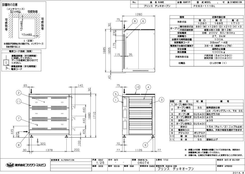 【マルゼン】デッキオーブン プリンス PEB3-111BL 幅1280×奥行1685×高さ1710 三相200V