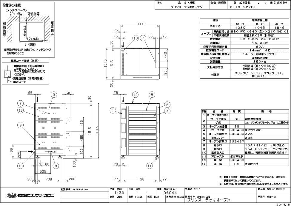 【マルゼン】デッキオーブン プリンス PET3-222BL 幅1280×奥行1045×高さ1845 三相200V