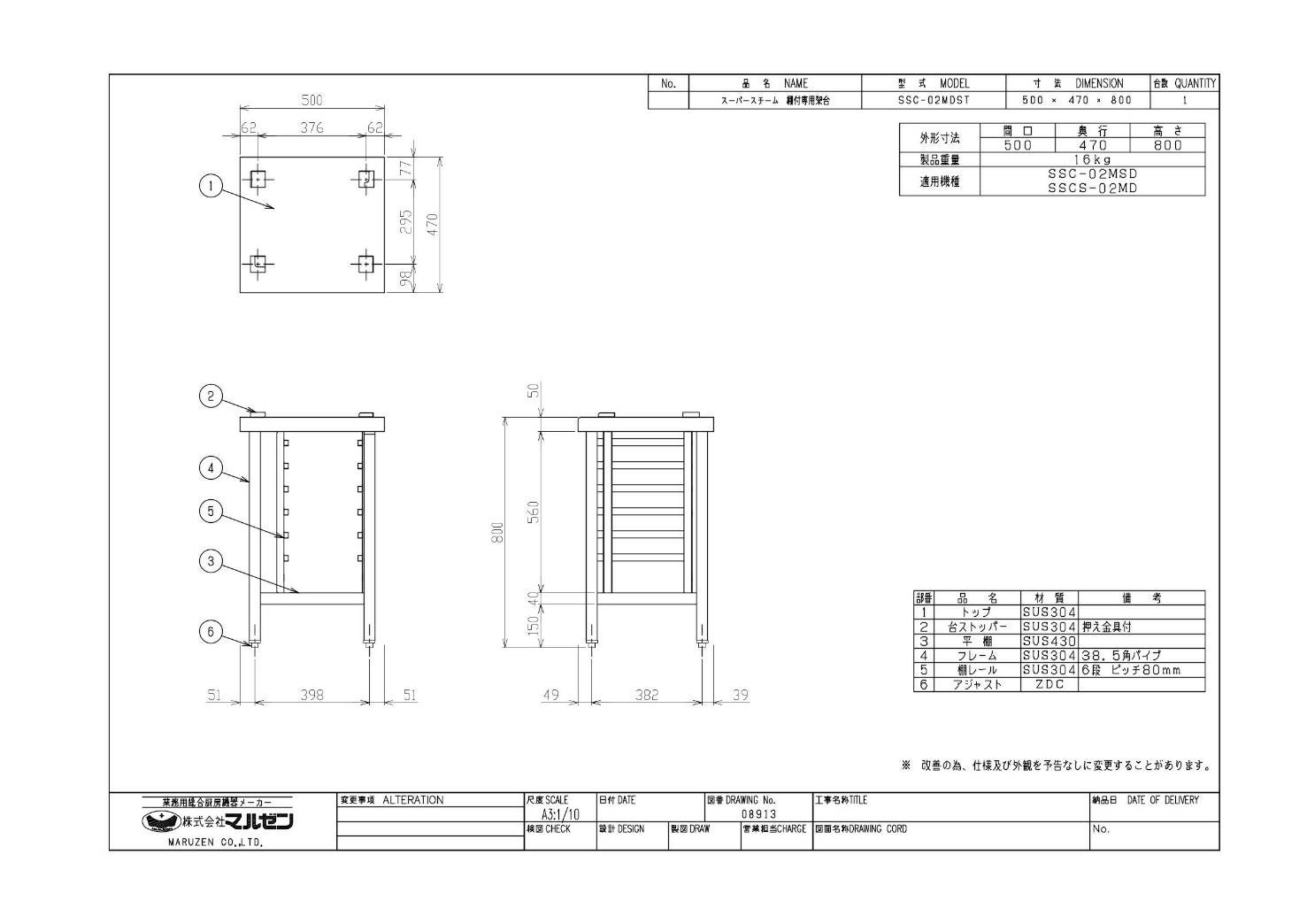 【マルゼン】スチームコンベクションオーブン棚付専用架台 SSC-02MDST 幅500×奥行470×高さ800mm