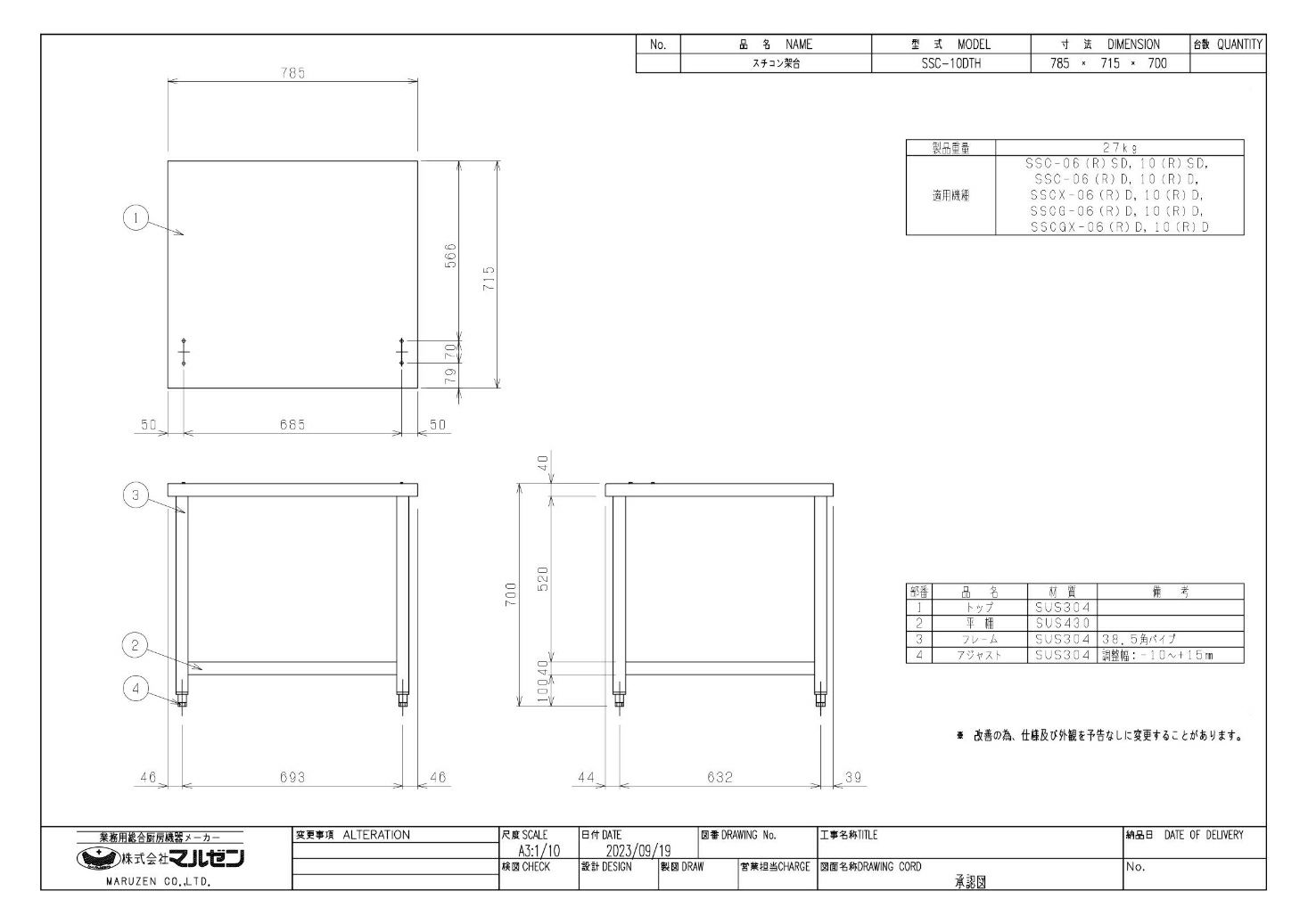 SSC-10DTH 【マルゼン】スチームコンベクションオーブン専用架台 幅785×奥行715×高さ700mm