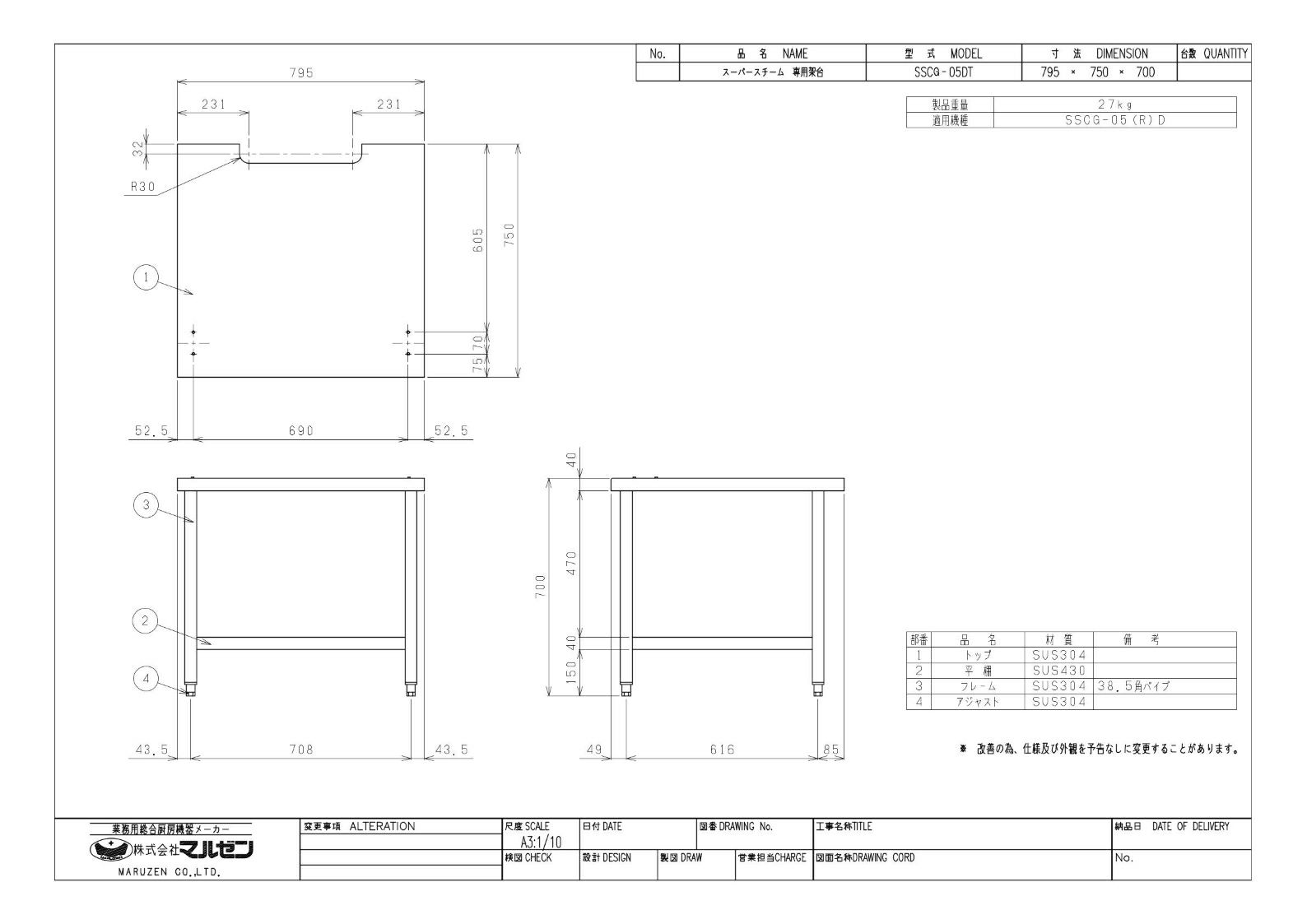 【マルゼン】スチームコンベクションオーブン専用架台 SSCG-05DT 幅795×奥行750×高さ700mm