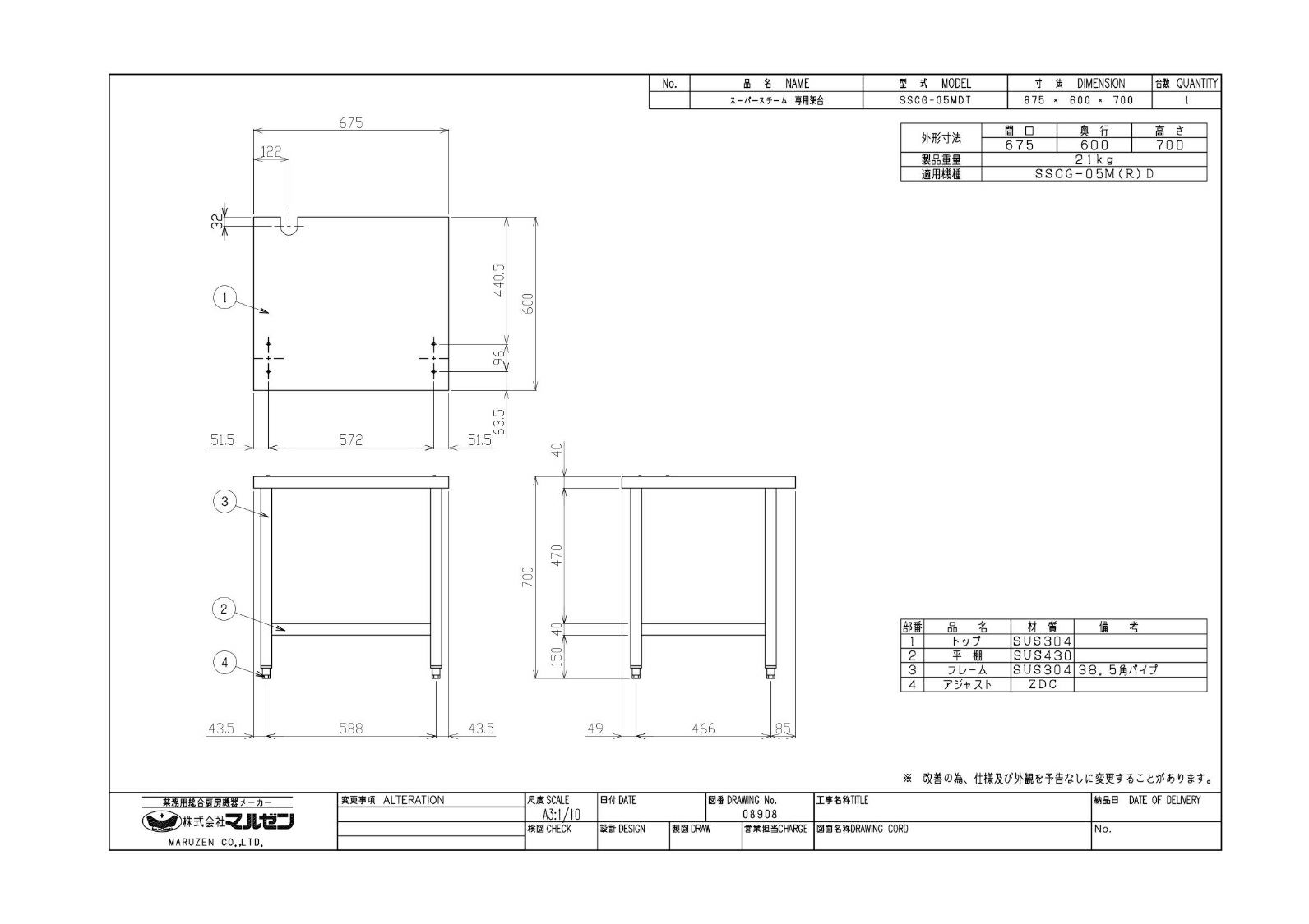 【マルゼン】スチームコンベクションオーブン専用架台 SSCG-05MDT 幅675×奥行600×高さ700mm