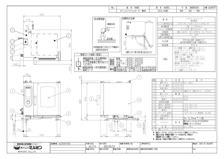 商品名:マルゼン スチームコンベクションオーブン スーパースチーム エクセレントシリーズ 電気式/SSCX-05MD/W680×D565×H685(mm)