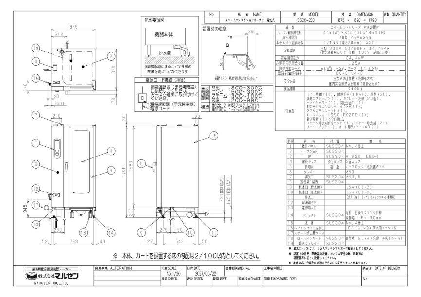 付属品:1/1焼網(10)、耐熱手袋(1セット)、液体洗剤(2L)、洗剤スプレーガン(1)、タブレット(固形)洗剤(20個)、ハンドシャワー(1)、減圧逆止弁(1)、排水用シリコンエルボφ48用(1)、32Aステンソケット(1)、ロールインカートSSC-RC20D(1)、メニューブック、オート調理用メニューCD、全自動軟水器(1)、スケール除去剤(2L)