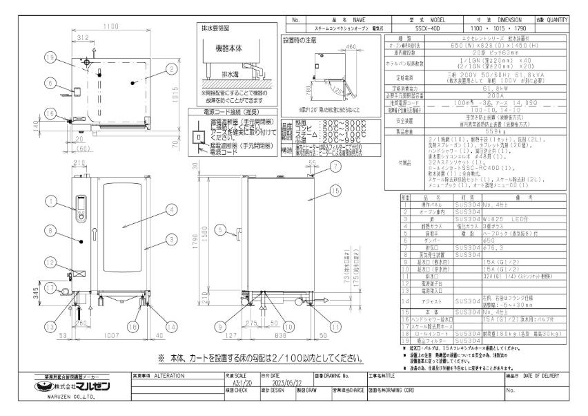 付属品:2/1焼網(10)、耐熱手袋(1セット)、液体洗剤(2L)、洗剤スプレーガン(1)、タブレット(固形)洗剤(20個)、ハンドシャワー(1)、減圧逆止弁(1)、排水用シリコンエルボφ48用(1)、32Aステンソケット(1)、ロールインカートSSC-RC40D(1)、メニューブック、オート調理用メニューCD、全自動軟水器(1)、スケール除去剤(2L)