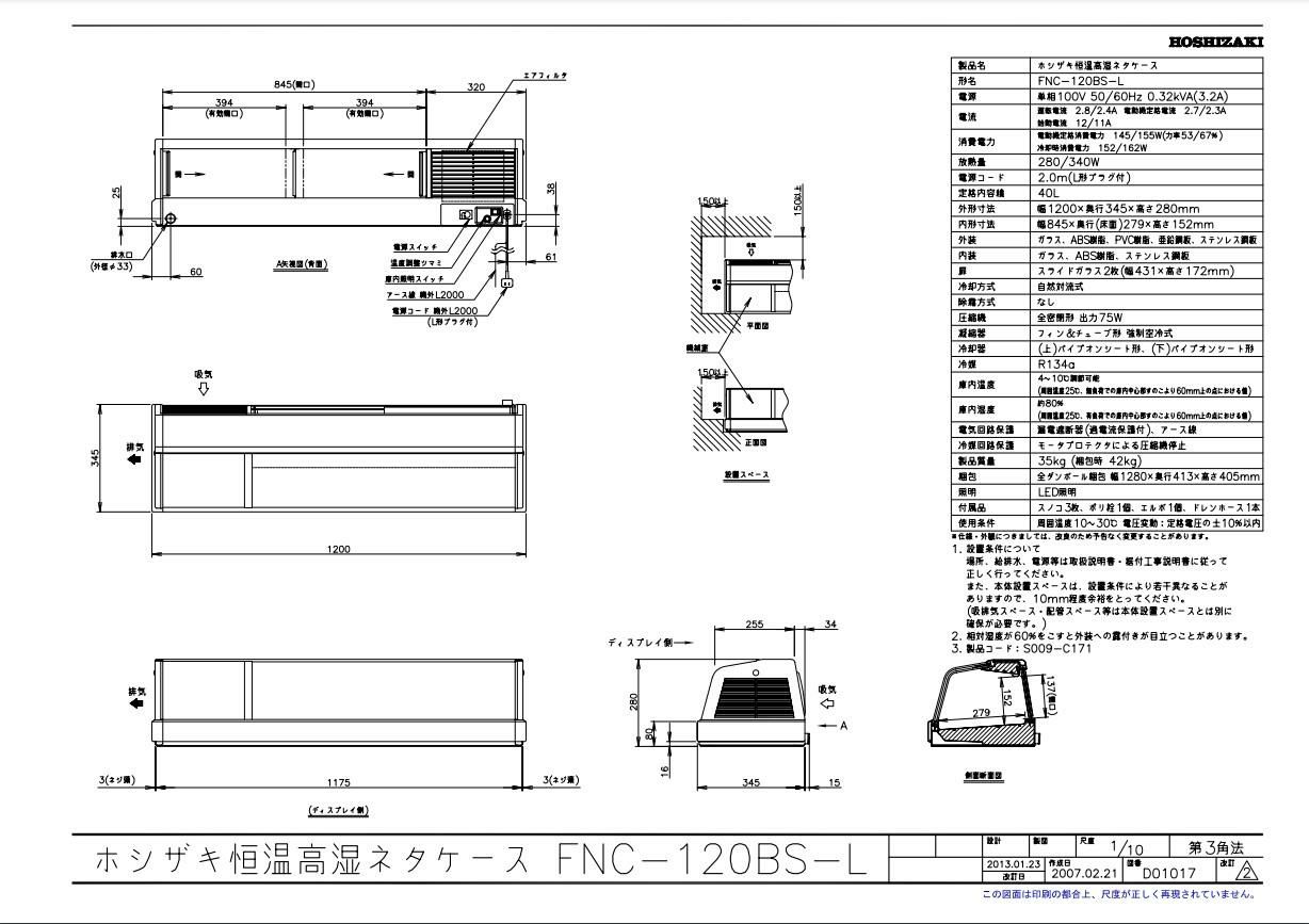 商品名:恒温高湿ネタケース FNC-120BS-L 幅1200×奥行345×高さ280(mm) 単相100V