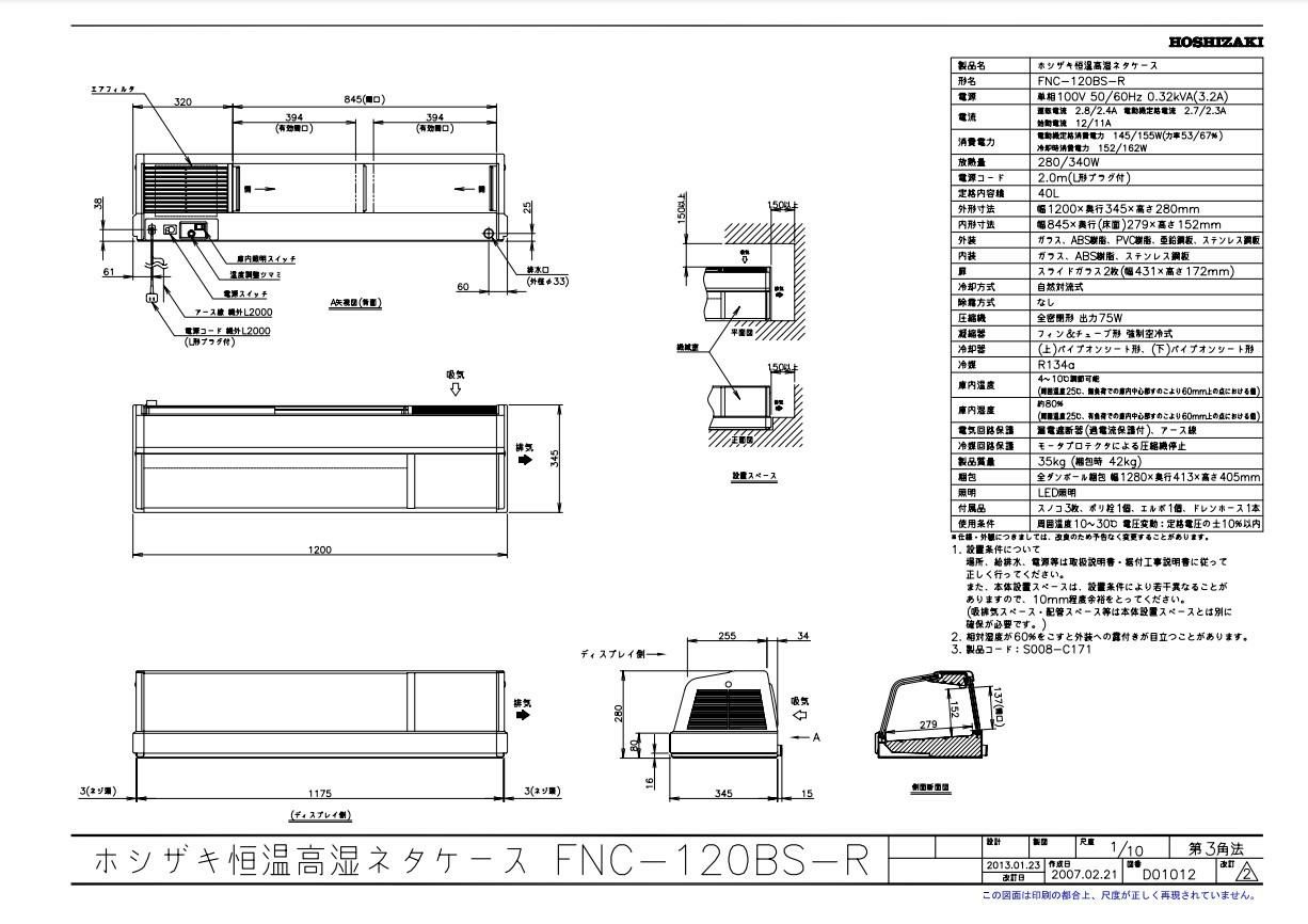 商品名:恒温高湿ネタケース FNC-120BS-R 幅1200×奥行345×高さ280(mm) 単相100
