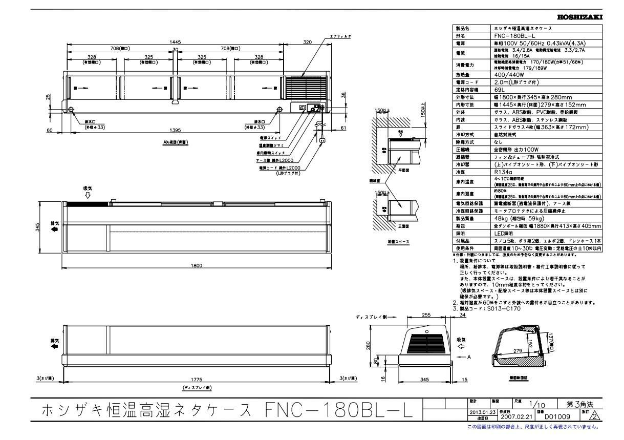商品名:恒温高湿ネタケース FNC-180BL-L 幅1800×奥行345×高さ280(mm) 単相100V